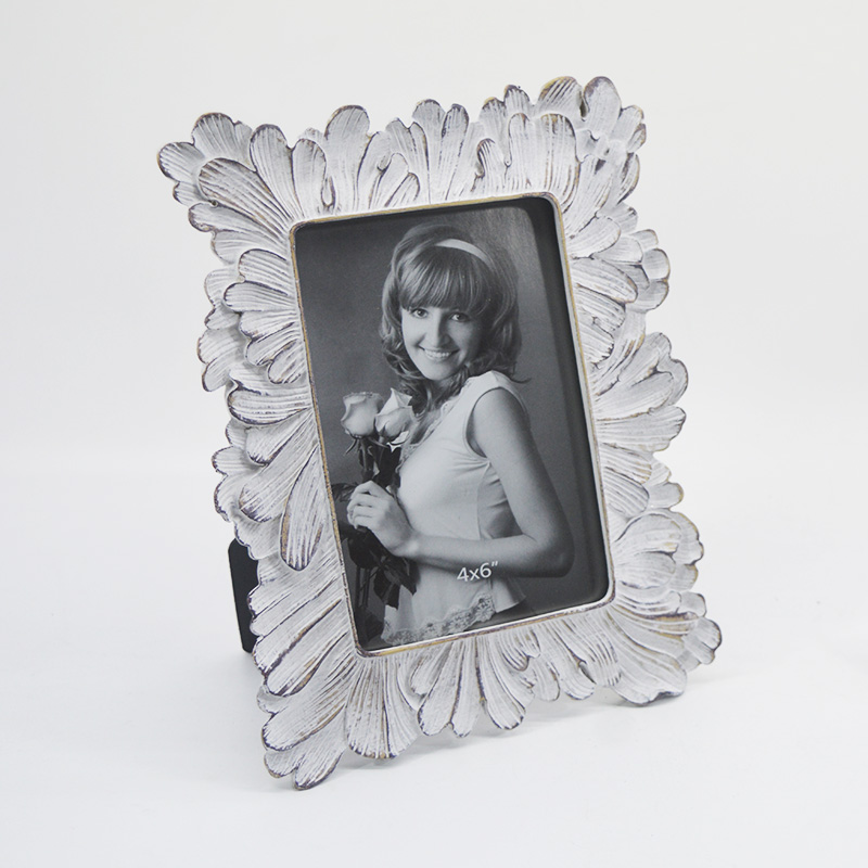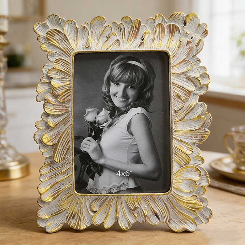 Ce cadre photo est un objet artisanal en résine de style vintage européen.Ce cadre photo présente une bordure composée de pétales superposés et déployés. L'association d'un fond blanc vieilli et de techniques de dorure lui confère un style rétro à la fois léger et luxueux. Adapté aux photos de 10 x 15 cm, il trouvera sa place sur un bureau ou une coiffeuse. Il constitue également un cadeau raffiné pour un mariage, une pendaison de crémaillère ou un anniversaire, apportant une touche de romantisme et de solennité au quotidien.