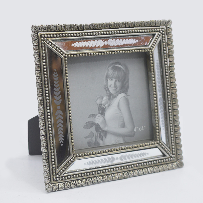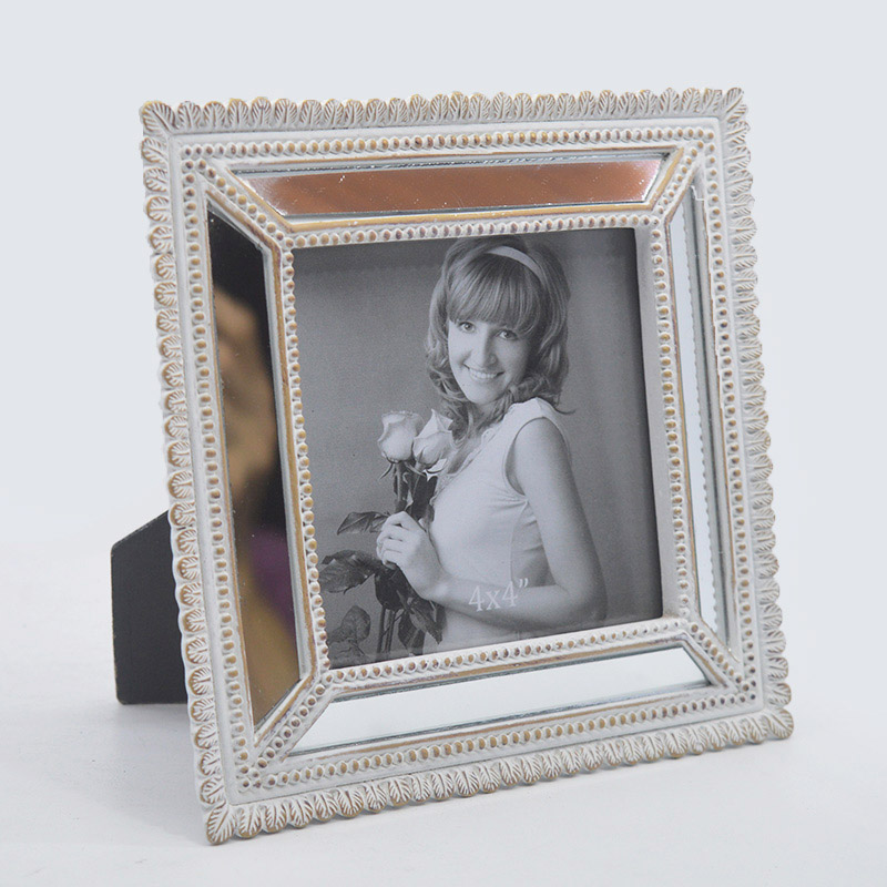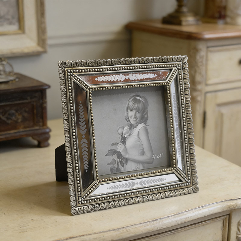Démonstration de compatibilité des tailles : Montrez l'effet de compatibilité du cadre photo avec Photos 4×4 pouces, présentant directement les dimensions carrées du cadre intérieur ; combinée à une disposition de table de style américain, elle souligne la compatibilité avec les maisons de style américain.