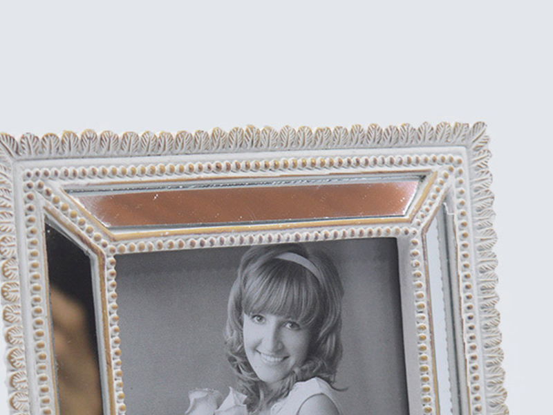 Gros plan sur les coins polis de l'argent/or/Cadre photo blanc imitation bois : La photographie met en valeur les bords arrondis et polis du cadre, révélant une finition lisse et sans rayures ; elle met également en évidence la texture épaisse et dense de la résine, ainsi que sa résistance à la déformation et à l’humidité.