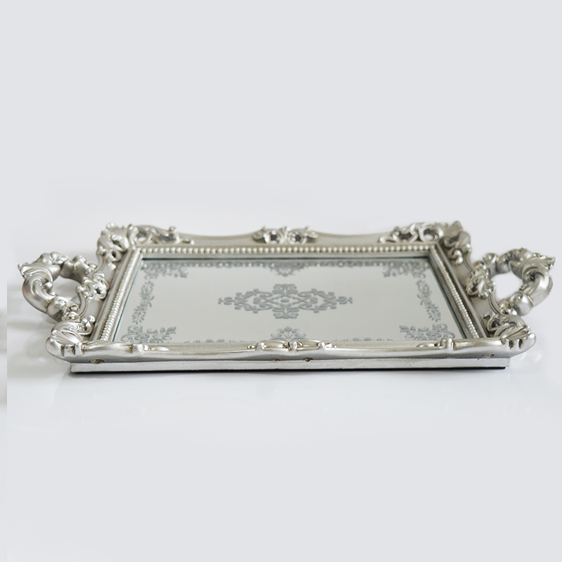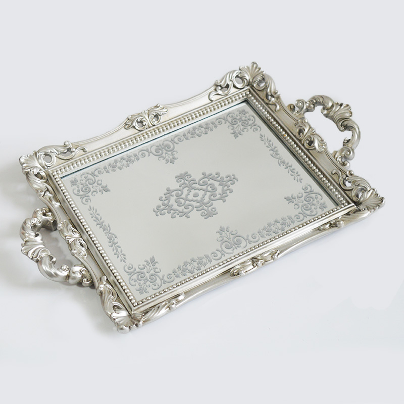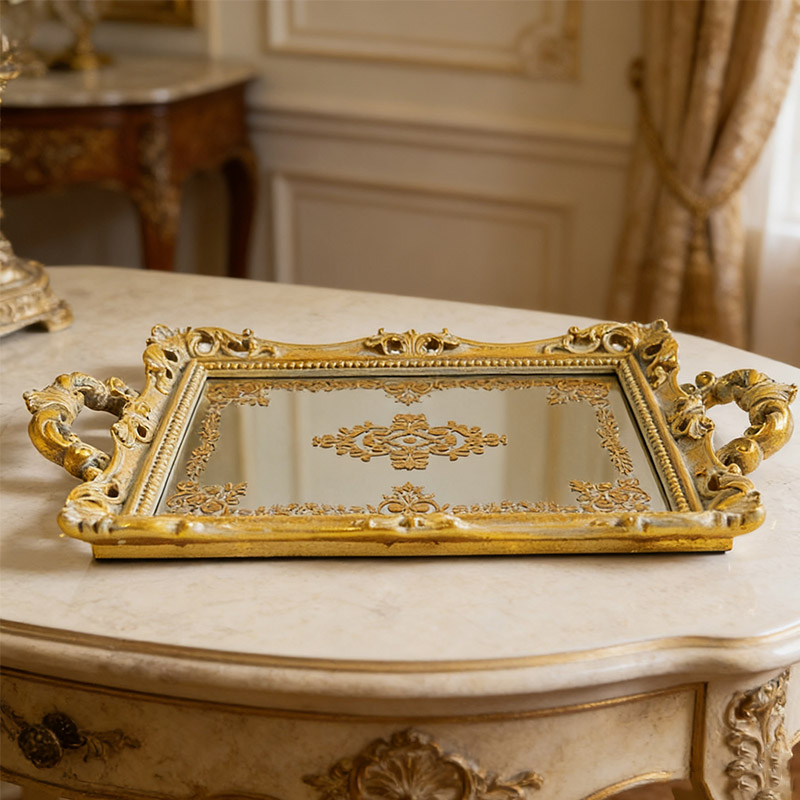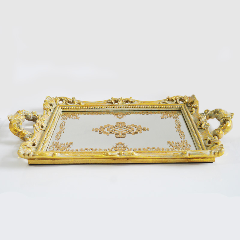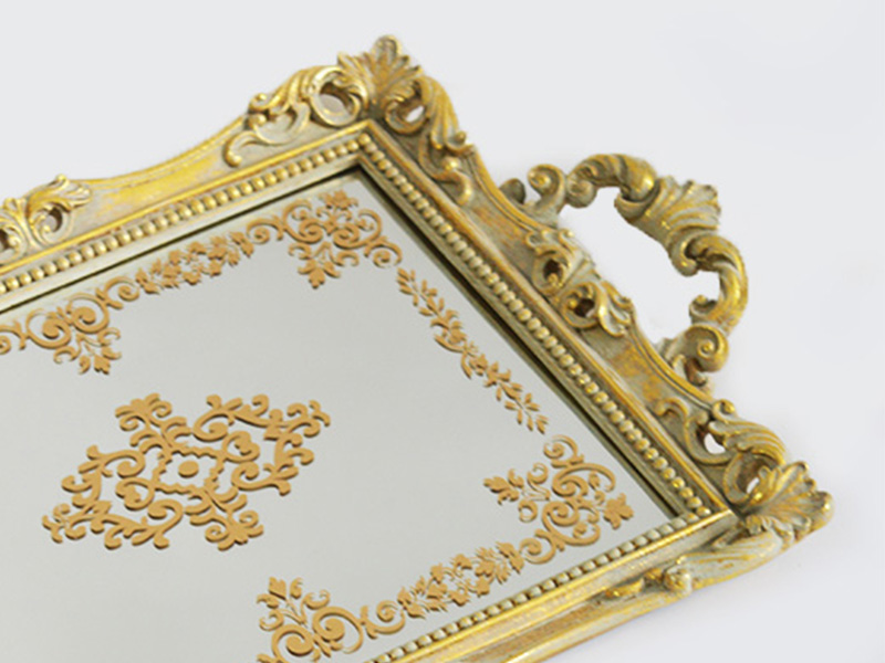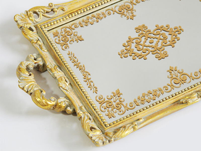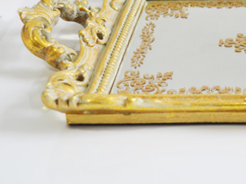 La structure principale est constituée de résine époxy :Fabriqué en résine polyester, ce plateau est à la fois dur et léger. Sa surface est ornée de dorures et d'un traitement vieilli, lui conférant une texture dorée impériale rétro. Le cœur du plateau est en verre miroir de 3 mm d'épaisseur, aux bords polis et arrondis. Il est sûr et résistant aux rayures.
