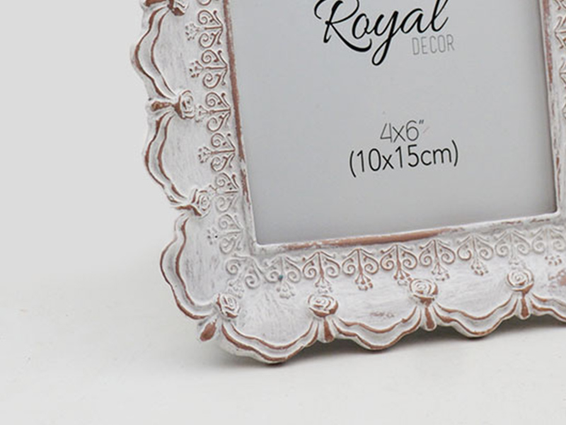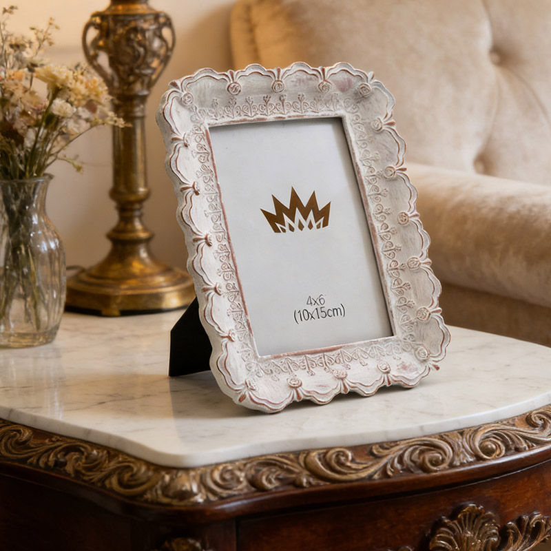 Cadre photo vintage sculpté en résine blanche vieillie 4×6 Fabriqué en résine écologique, ce cadre est sculpté à la main et patiné avec soin. Son cadre rose et blanc dégradé est orné de délicats motifs de volutes et de couronnes.