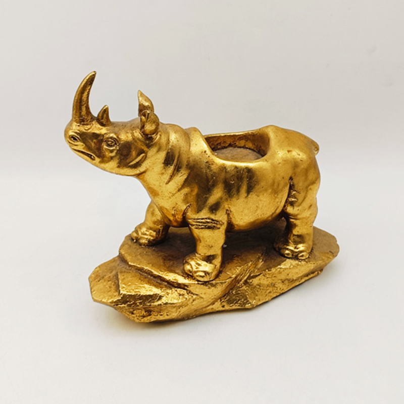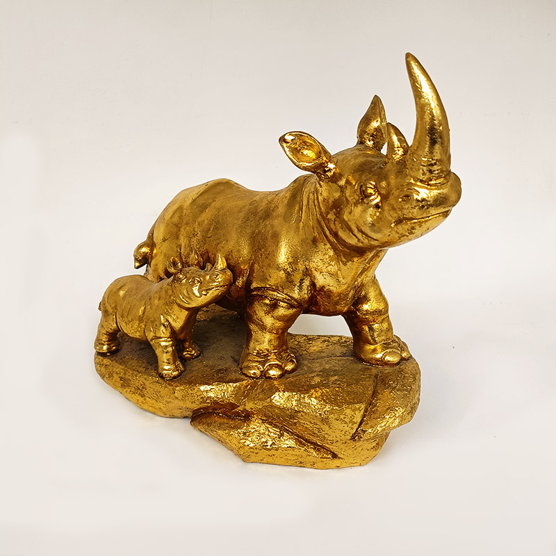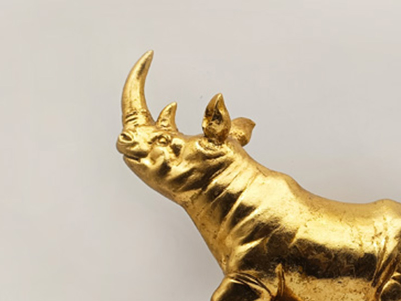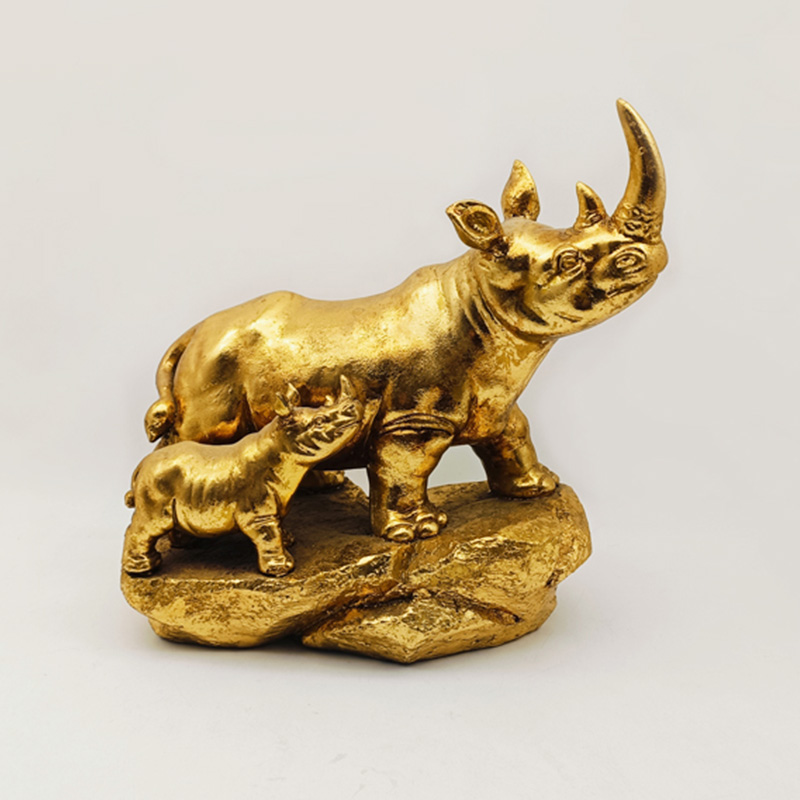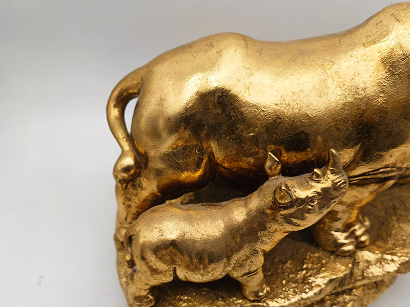 La partie principale est en résine, un matériau très malléable qui permet de reproduire avec précision les lignes musculaires puissantes, la texture rugueuse de la peau et l'acuité de la corne du rhinocéros. Effet or ancien : elle présente un aspect vieilli.