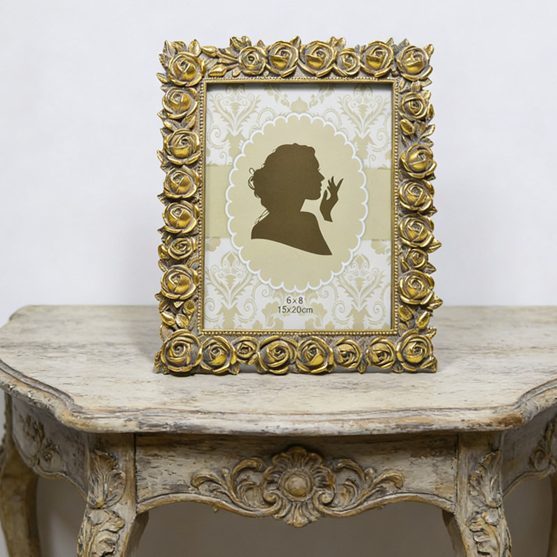 We provide high-quality polyresin photo frames with a vintage baroque design. This Model 1789 features a hand-painted antique blue and gold finish, suitable for home decor retailers, gift shops, and wedding supply distributors. The product combines durable resin construction with a real glass front, ensuring high perceived value for your end customers.