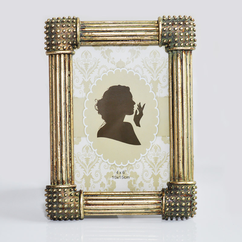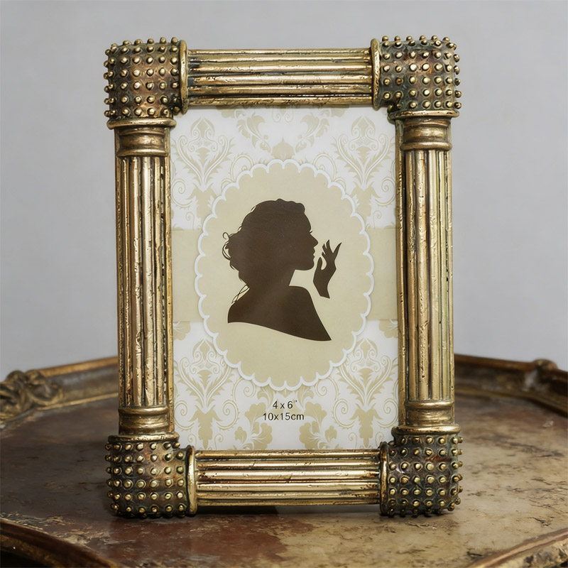 Inspired by ancient Greek and Roman architecture, this European-style classic photo frame features vertical fluted columns and studded corner accents. Crafted from eco-friendly resin with an antique gold and bronze finish, it exudes a timeless vintage charm with meticulous handcrafted details. The frame comes with a sturdy stand for tabletop display or wall mounting, perfectly fitting 4"×6" standard photos. It is an ideal decor piece for vintage homes, cafes, and bed-and-breakfasts, as well as a thoughtful gift for loved ones