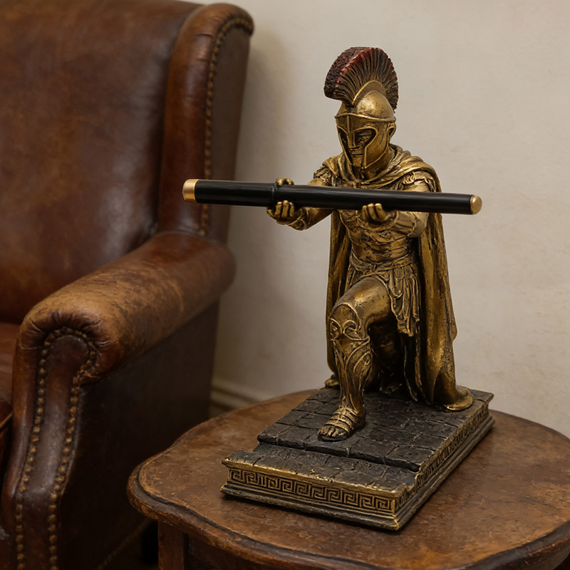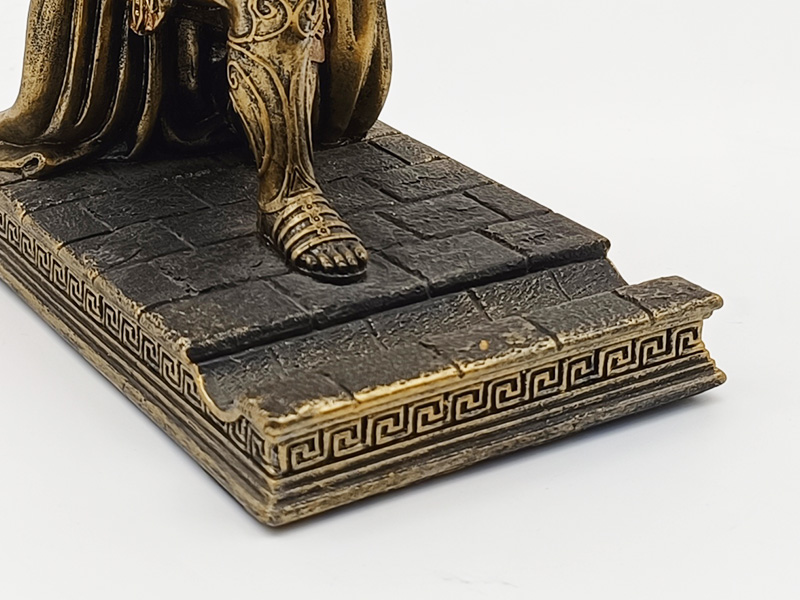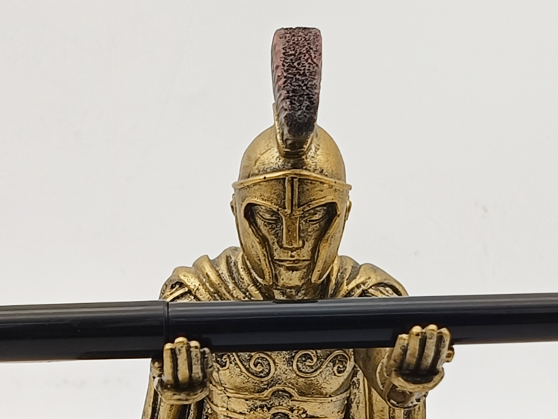 Le corps principal est en résine : sa surface est traitée avec un effet cuivre-or antique, lui conférant une texture métallique mate. Certaines zones (comme le panache du casque et les interstices de l’armure) arborent un effet vieilli foncé accentuant le style rétro. La base imite la pierre et les bords sont ornés de volutes grecques, ajoutant une touche de charme classique.