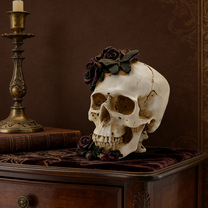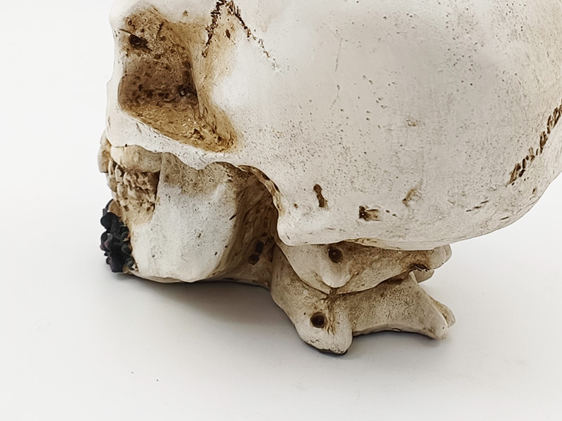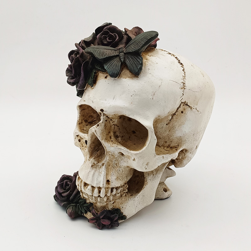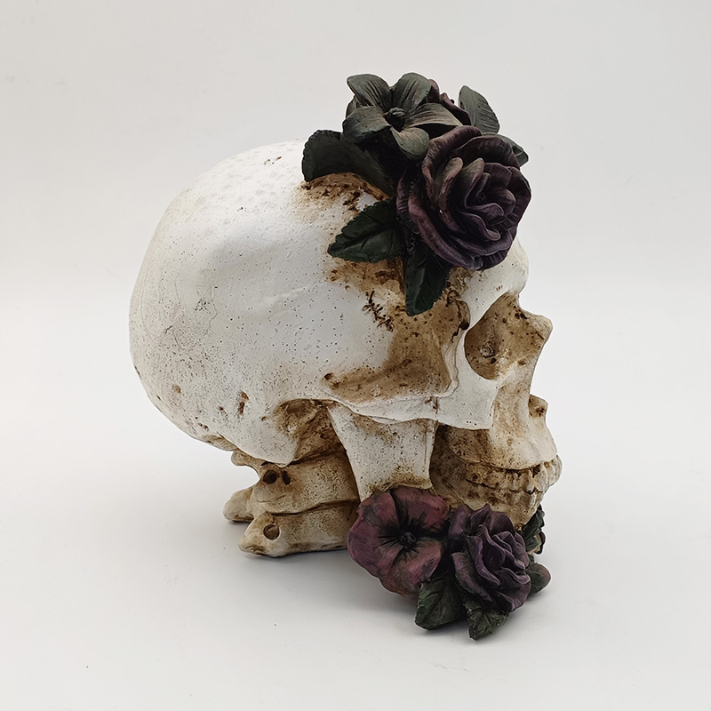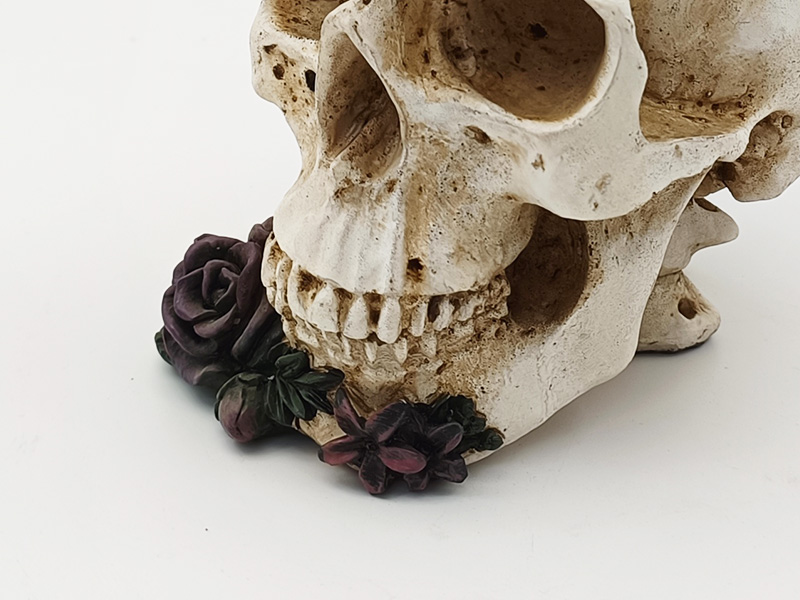 Fleurs et décorations : Sur le haut du crâne et au niveau de la mâchoire inférieure, on distingue des roses d'un violet profond en trois dimensions. Les pétales, nettement superposés, présentent une texture fine, passant du violet profond au rose foncé. La texture est d'un réalisme saisissant. À côté des roses,