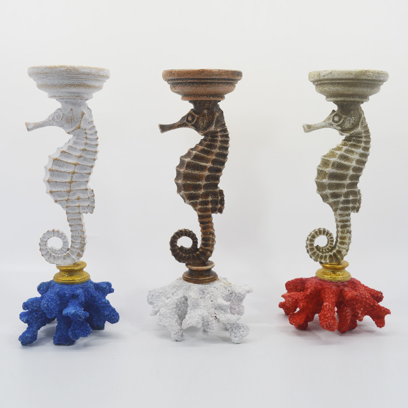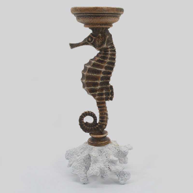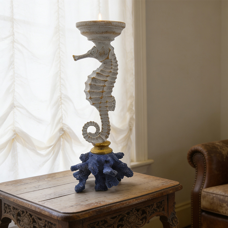 - Le socle adopte une forme de corail bleu simulé, avec des textures ramifiées éparses, faisant écho au thème marin de l'hippocampe et renforçant l'effet d'ensemble de la scène.